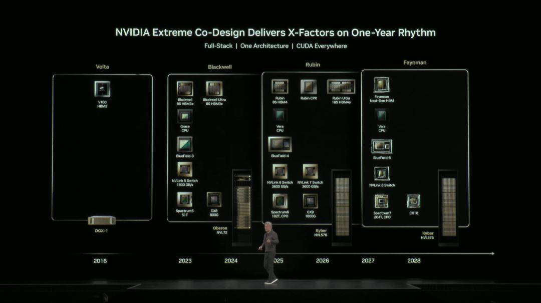 现场,老黄再次搬出了,未来三年英伟达GPU路线图,从Blackwell,到Rubin,再到Feynman。