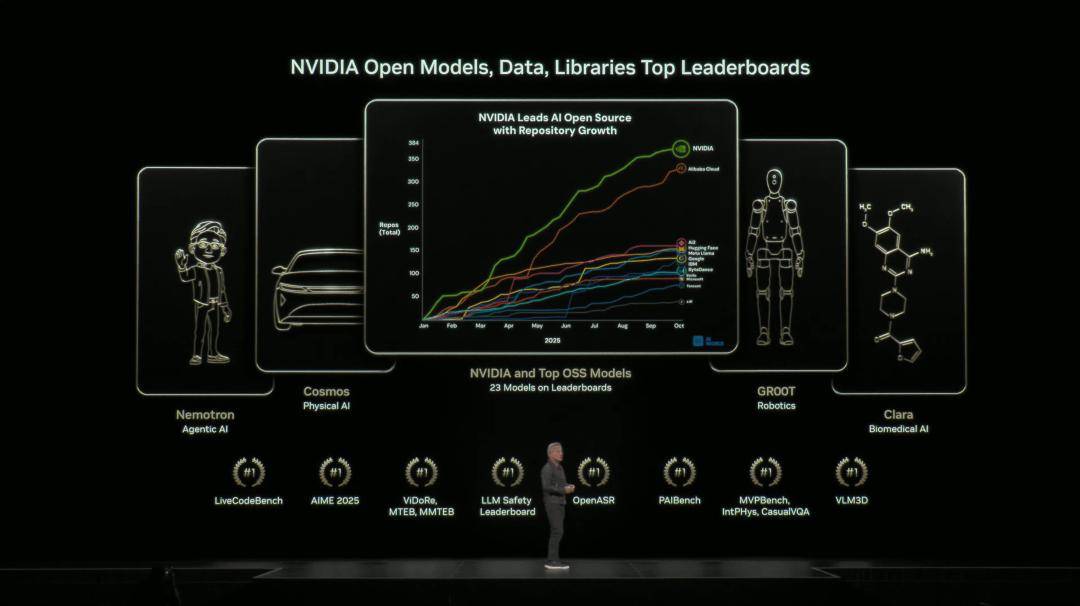 为此,英伟达也在全力投入这一方向。目前,他们在全球开源贡献榜上,23个模型上榜,覆盖了语言、物理AI、语音、推理等全领域。