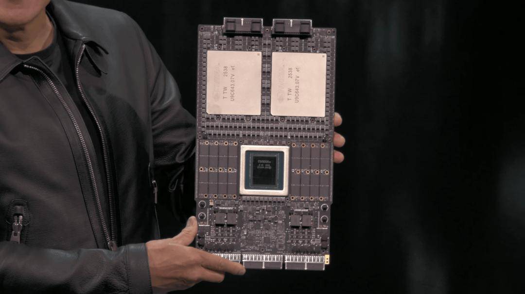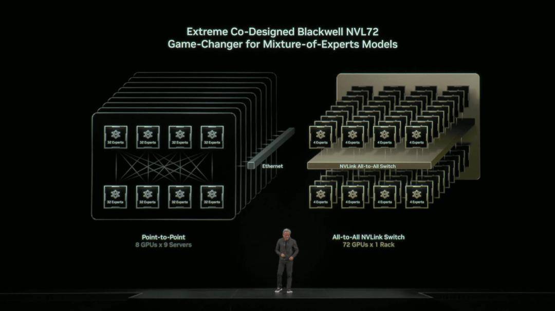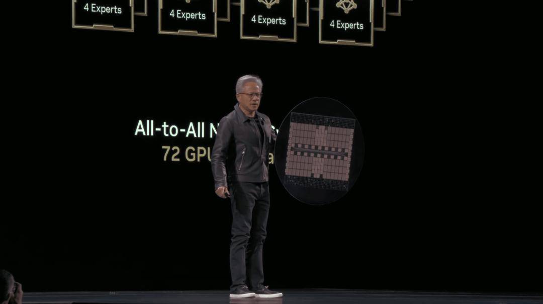 为了更直观说明,老黄再次上演「芯片版美队」,手里拿着巨型芯片,由72块GPU无缝互联。