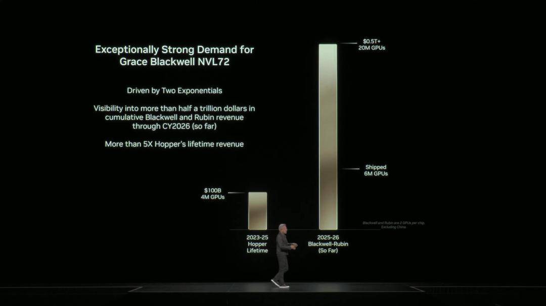 最令人震惊是,他预测,截至2026年,Blackwell+Rubin的可预见性收入累计5000亿美元。