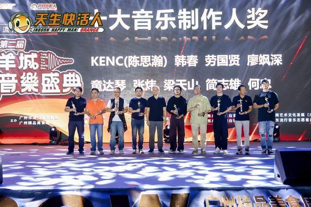 荣获第二届羊城音乐盛典十大音乐制作人奖的有:KENC(陈思瀚)、韩春、劳国贤、廖飒深、童达琴、张炜、梁天山、简志雄、何忠。原广东广播电视台副总编辑、粤港澳大湾区音乐艺术联盟常务副主席谭天玄为十大音乐制作人颁奖。