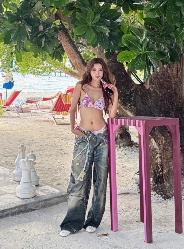 她穿的这身衣服颜色搭配的也很好看,粉白色的比基尼,配上3D打印上的金属感的裤链,站在马尔代夫透亮的海水和阳光下,看着特别清爽时髦。