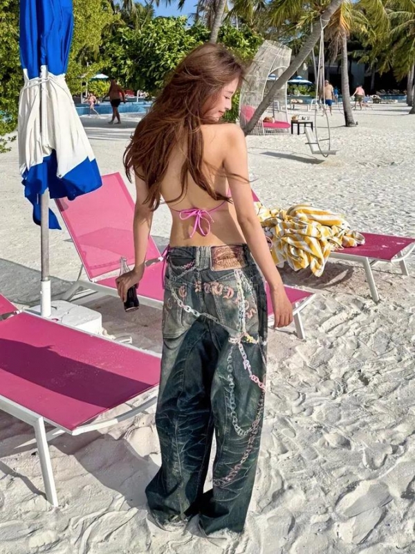 最大亮点是她穿了个比基尼配牛仔裤!她穿了个比基尼上衣,下面搭了条很潮的牛仔裤,裤腰上挂着一条亮闪闪的像糖果的裤链,特别抢眼。大家觉得这个穿法又性感又有点街头酷劲儿,都说原来海边还能这么穿。